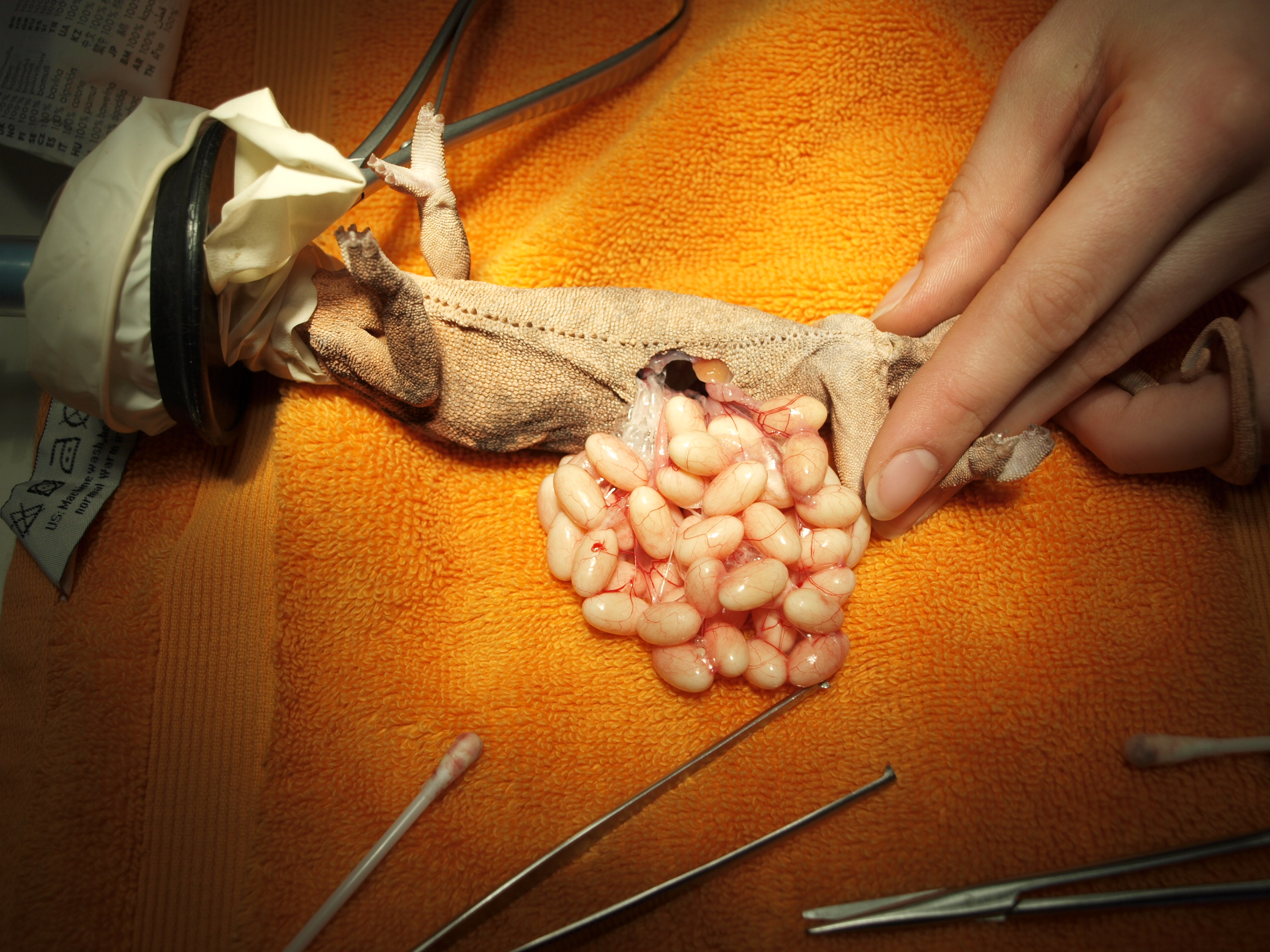 Im frühen Stadium kann eine Hormonbehandlung die Eiablage auslösen, im fortgeschrittenen Fall rettet nur noch eine operative Entfernung der Eier das Leben des Tieres. Die Operation bietet auch die Gelegenheit den Legedarm zu entfernen und hierdurch das Tier quasi zu kastrieren und somit eine Wiederholung der Legenot zu verhindern. Es ist oft unglaublich wie viele und wie große Eier wir aus den Chmäleons rausholen.